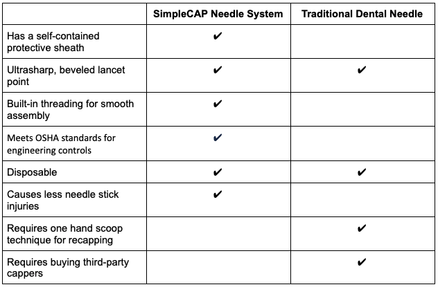 Unlike traditional needles, the SimpleCAP needle promotes safety during assembly, usage, recapping, disassembly, and disposal. The result is a needle system that makes patients more comfortable and staff much safer. It’s easy to see why when you look at the product feature.